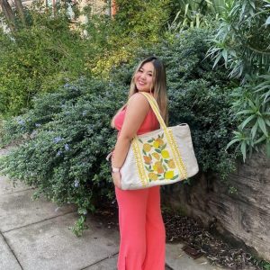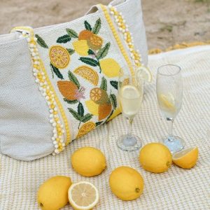 - Complements the Artisanal Aesthetic Pairs beautifully with the hand-beaded lemons and jacquard fabric, enhancing the tote’s unique, handcrafted appeal.