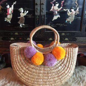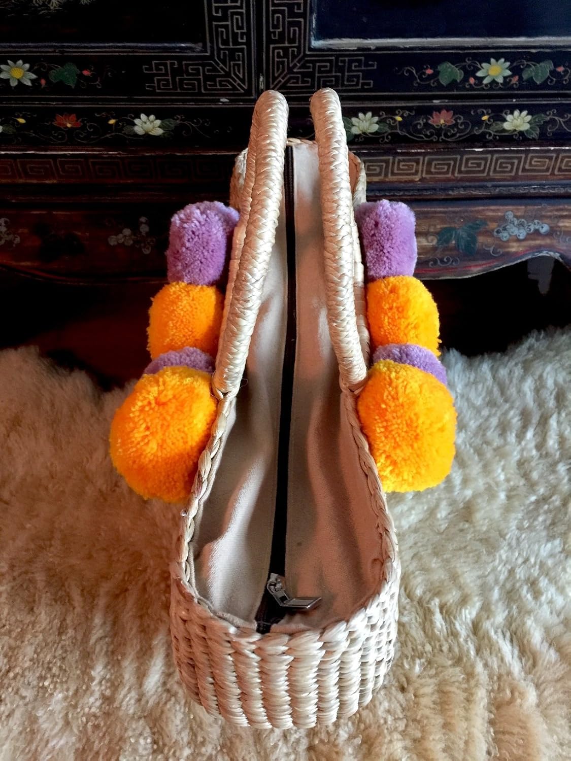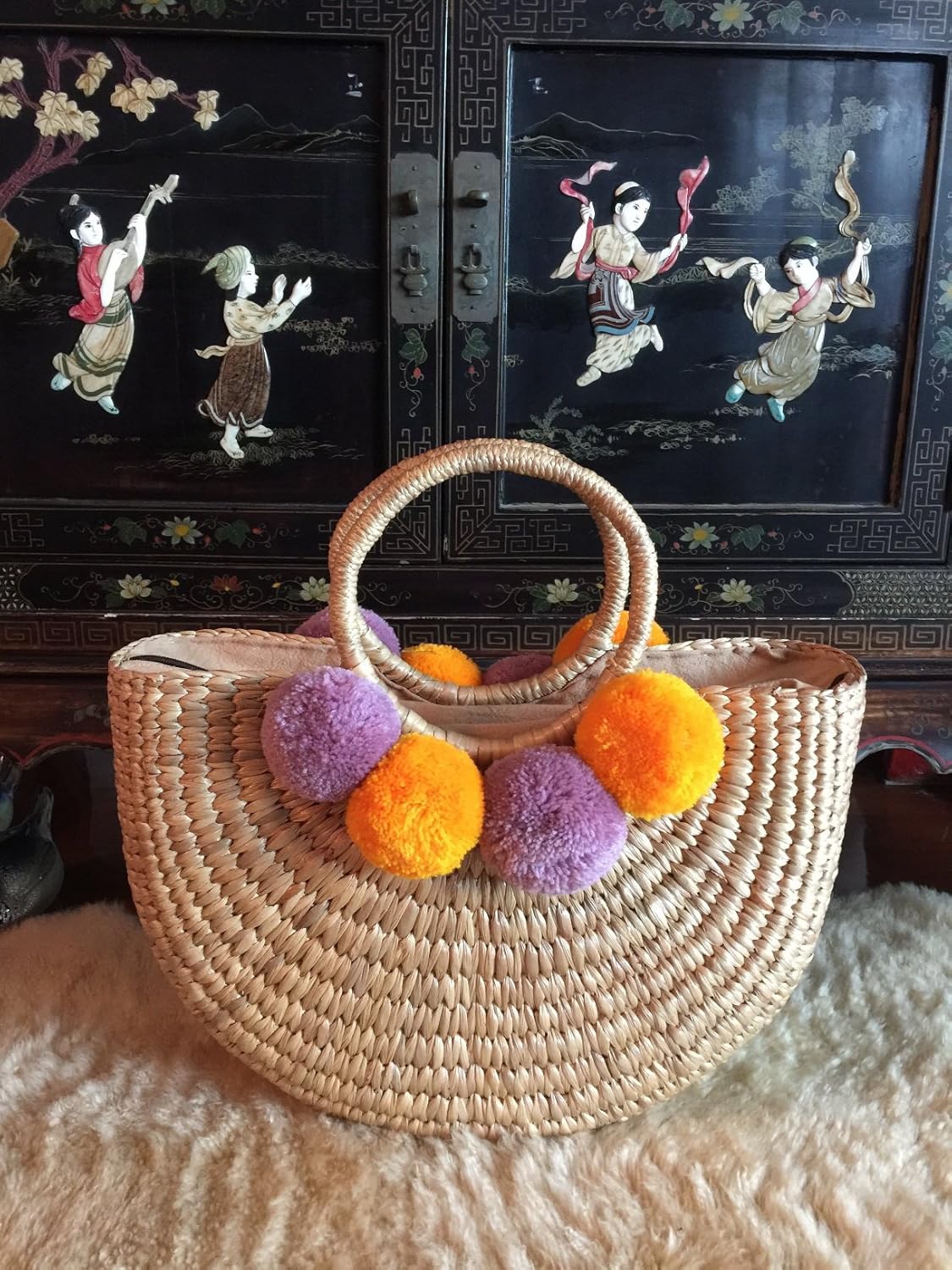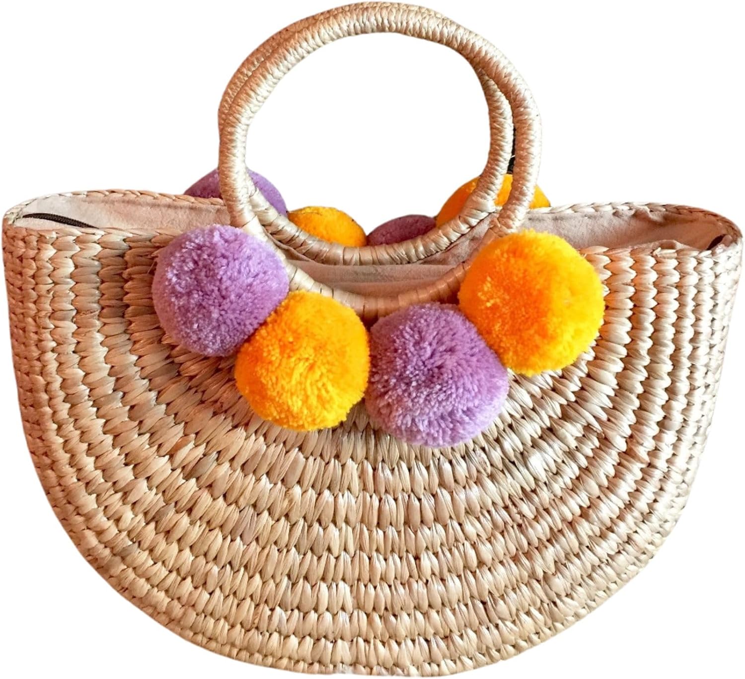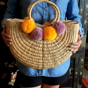 The woven market bag/straw beach bag comes complete with the shown attached colorful accessory. The Bag lined with beige textile lining ,trimmed with 4 colorful pom poms on both side of the bag and decorated with a tassel. Measurements 16.5 Inches Length (side-to-side) x 11.7 inches Height (top-to-bottom) x 5 Inches Width Handles: 6 Inches (to the top of the bag) Weight: 2 pound Material: Water Hyacinth Straw,Color Pom Pom,Cotton Fabric Lining,Seagrass Straw,Zip Closure,Colorful Tassel This delightful large straw bag with pompom detailing makes the ultimate summer accessory and works great as a beach or pool bag. It also works marvelously if you’re in need of a shopping tote for strolling the city in the summer sun. A perfect gift for yourself and anyone you love. All of our pieces are handmade with love!