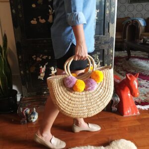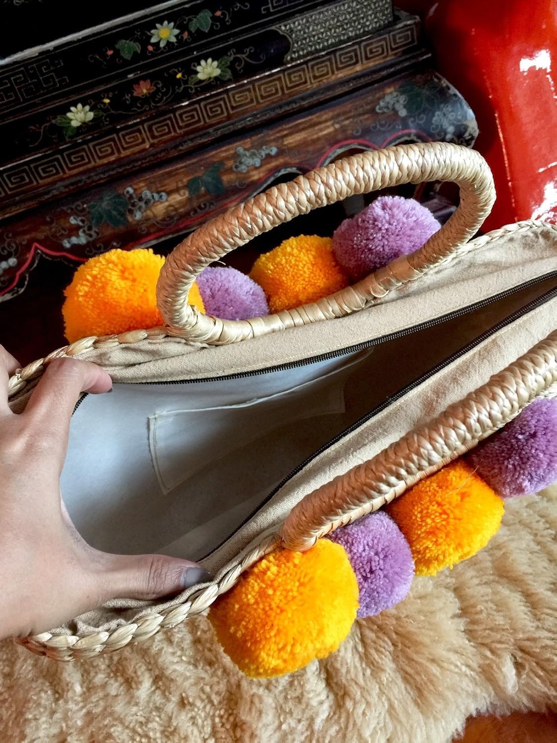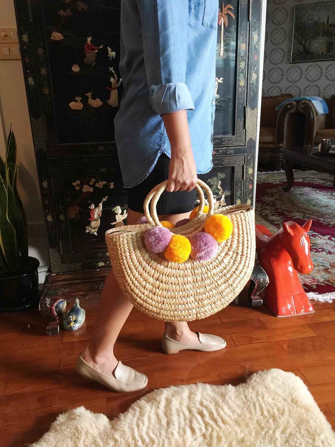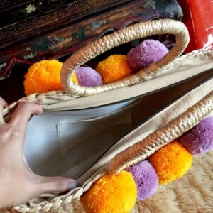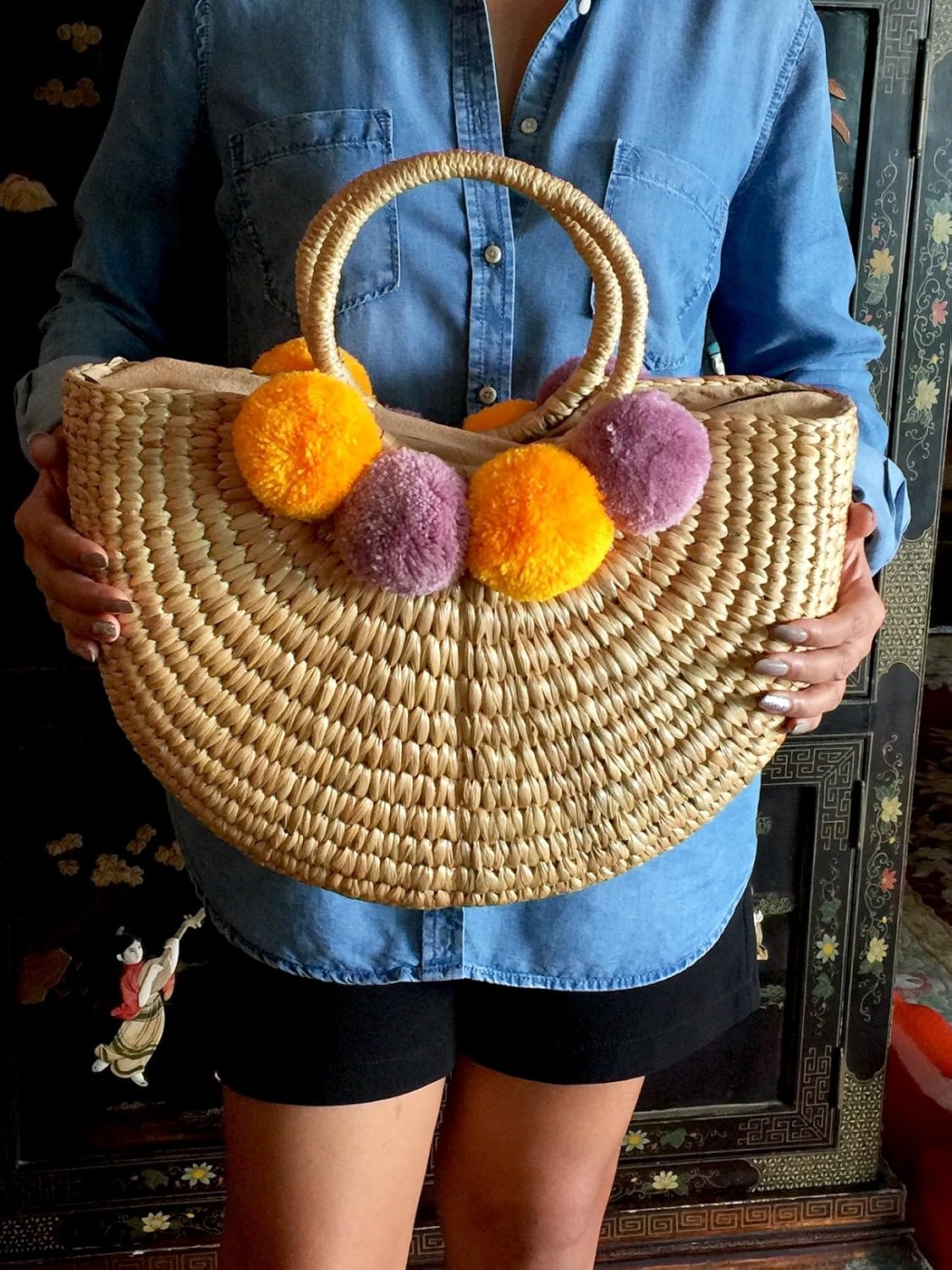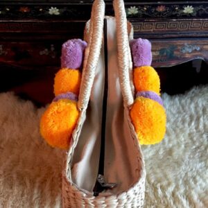 The woven market bag/straw beach bag comes complete with the shown attached colorful accessory. The Bag lined with beige textile lining ,trimmed with 4 colorful pom poms on both side of the bag and decorated with a tassel. Measurements 16.5 Inches Length (side-to-side) x 11.7 inches Height (top-to-bottom) x 5 Inches Width Handles: 6 Inches (to the top of the bag) Weight: 2 pound Material: Water Hyacinth Straw,Color Pom Pom,Cotton Fabric Lining,Seagrass Straw,Zip Closure,Colorful Tassel This delightful large straw bag with pompom detailing makes the ultimate summer accessory and works great as a beach or pool bag. It also works marvelously if you’re in need of a shopping tote for strolling the city in the summer sun. A perfect gift for yourself and anyone you love. All of our pieces are handmade with love!