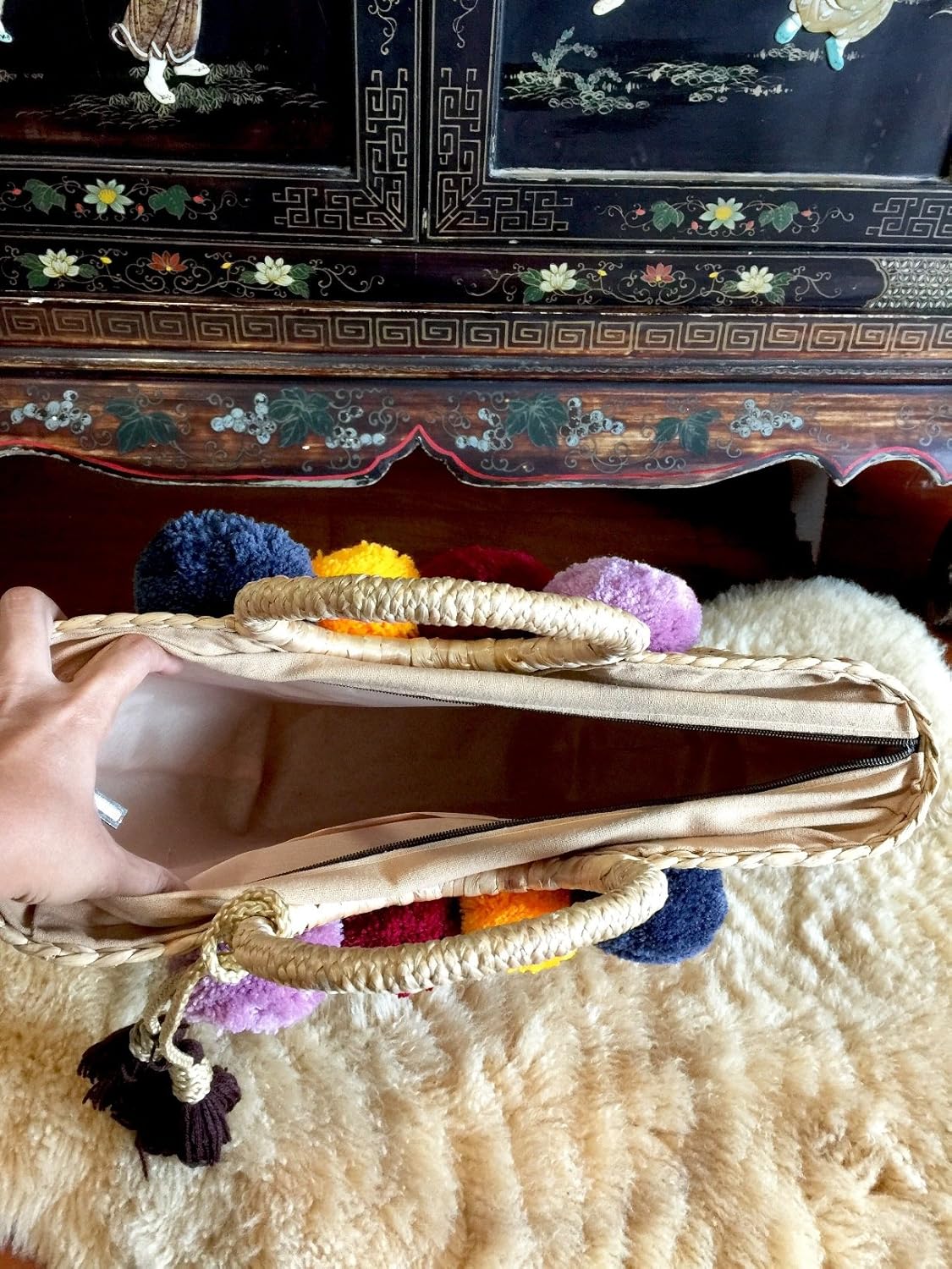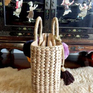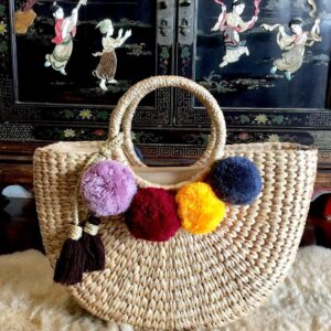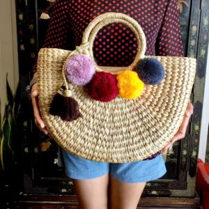The woven market bag/straw beach bag comes complete with the shown attached colorful accessory. The Bag lined with beige textile lining ,trimmed with 4 colorful pom poms on both side of the bag and decorated with a tassel. Measurements 16.5 Inches Length (side-to-side) x 11.7 inches Height (top-to-bottom) x 5 Inches Width Handles: 6 Inches (to the top of the bag) Weight: 2 pound Material: Water Hyacinth Straw,Color Pom Pom,Cotton Fabric Lining,Seagrass Straw,Zip Closure,Colorful Tassel This delightful large straw bag with pompom detailing makes the ultimate summer accessory and works great as a beach or pool bag. It also works marvelously if you’re in need of a shopping tote for strolling the city in the summer sun. A perfect gift for yourself and anyone you love. All of our pieces are handmade with love!