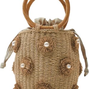 Summer Straw Bag for Women Pearl Flower Bucket Tote Bag Diamond Handbag Hand Woven Rattan Shell Purse Drawstring