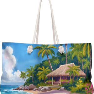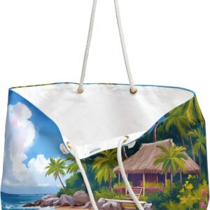 Tropical Bungalow Oil Painting Print Oversized Shopping Bag Summer Beach Bag Vacation Travel Tote Reusable Bag Pool Bag Gift Gift for Her Gift for Woman Our oversized Weekender Tote is perfect for your weekend at the beach or in town. The wide-mouthed, durable bag holds a generous amount of personal items and is easily held by its thick rope handles. 100% Spun Polyester Exterior One size: 24″ x13″ (60.9 cm x 33 cm) Cream sheeting interior lining (50% cotton, 50% polyester) T-bottom Assembled in the USA from globally sourced parts Please note: Size tolerance 0.75″ (1.9 cm)