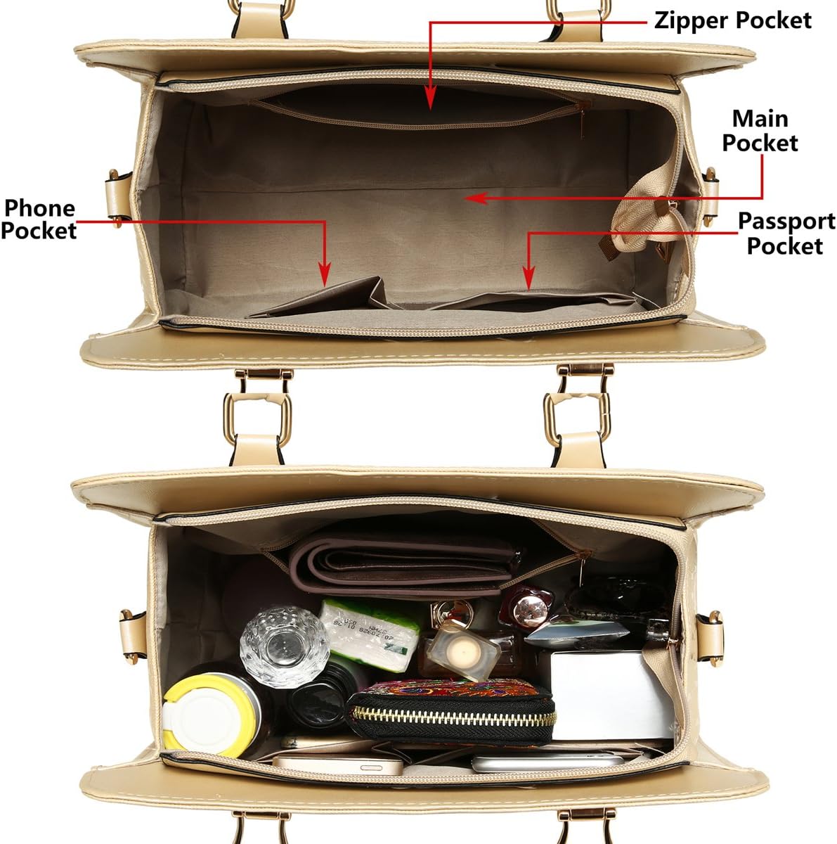 - The purse set can hold your iPad, wallet, makeups, phone, perfumes, gloves and other your daily use items and keep them organized.